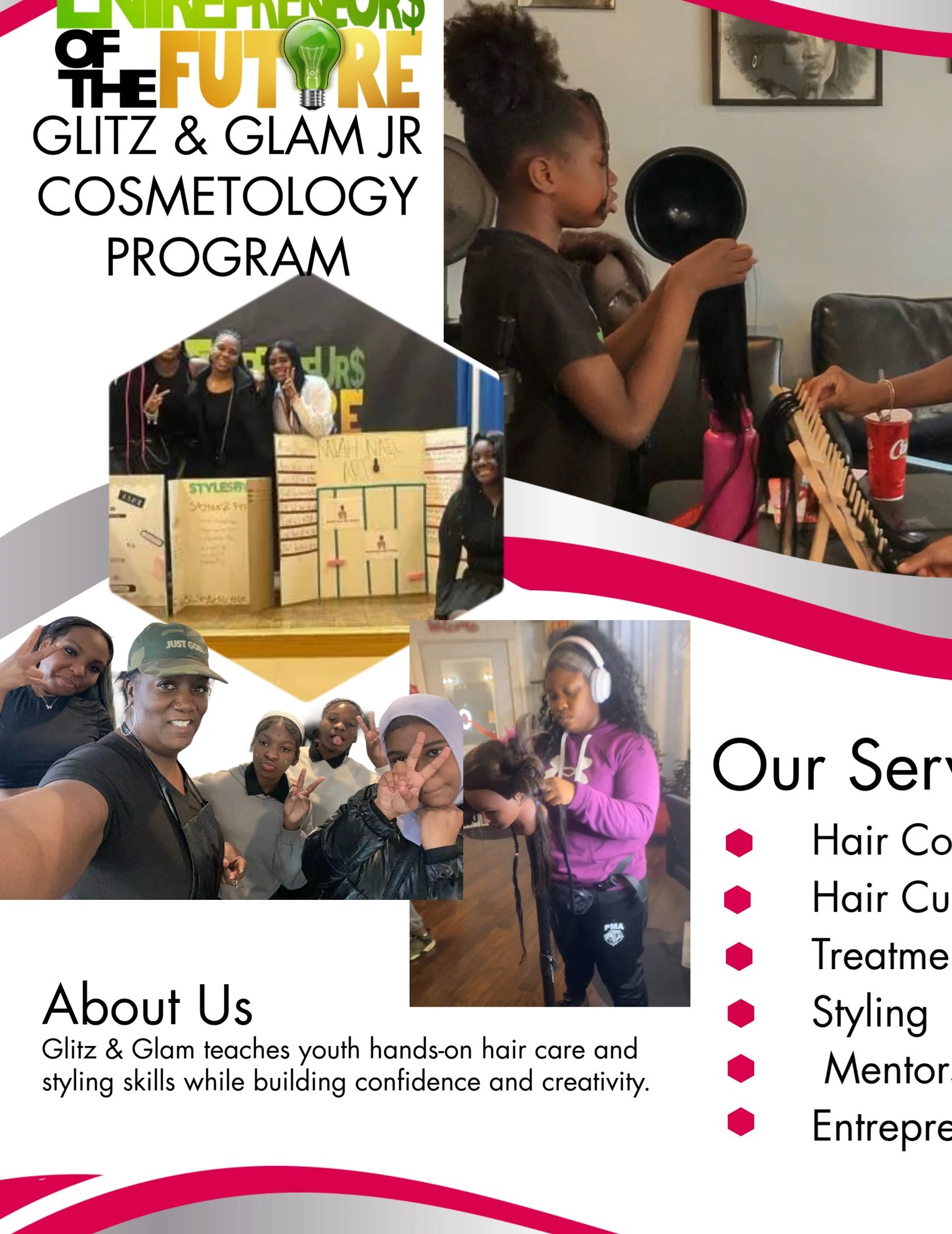 Glitz & Glam Jr. Cosmetology | Oct 13–Nov 19 | Mondays 5:30–6:30 PM on Zoom: business & marketing skills | Wednesdays In-Salon: hands-on cosmetology training. Build beauty & business skills!